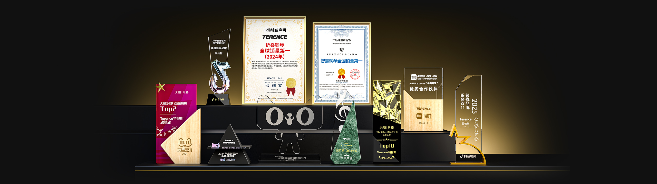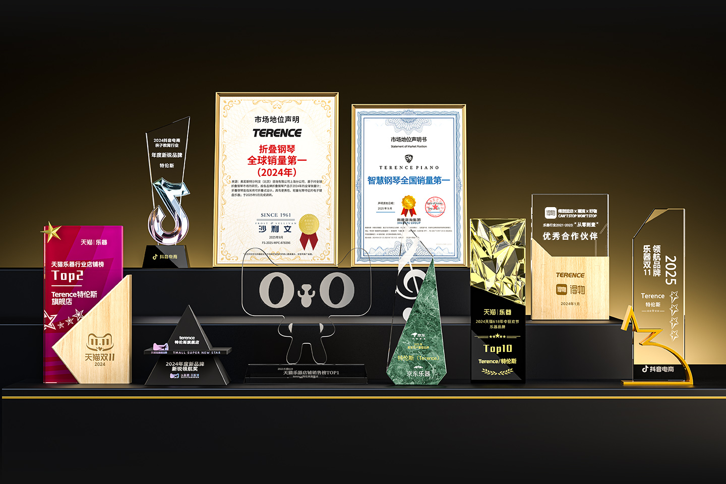 特倫斯創(chuàng)新科技榮獲:智慧鋼琴全國銷量第一[1]、2022年天貓樂器行業(yè)TOP1、2023年天貓618樂器行業(yè)TOP1、2024抖音電商年度新銳品牌、2024天貓樂器店鋪TOP2、2024天貓年度新品牌新銳領(lǐng)航獎、2023年京東最受用戶喜愛品牌等獎項;